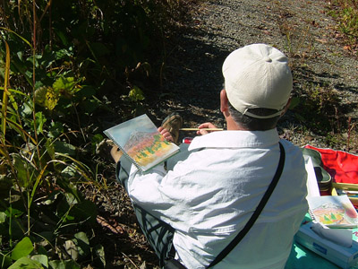 NO.461 冠雪鳥海山と紅葉に誘われてて〜〜(^。^) (07/10/23)雨が3日間も続き、家事に専念(^_-)-☆ 昨夜は雷も凄かったのに、今朝は冠雪鳥海山が顔出しました♪ 「スケッチに行くよ〜」とまたまた誘われて・・・(^。^)![]() 今日は、3合目辺りの堰口から法体の滝に向かう観光道路を通りながらスケッチすることにしました(^。^) 滝の紅葉が、どのくらい進んでるのか楽しみ〜〜♪ 最初描いた場所は、発電所の溜池。 鳥海山がこんな素敵な顔見せてくれましたよ〜♪ ![]() ここが発電所の溜池ですが、方向が違うので逆さ鳥海山は見られません。 ![]() 本日の「法体の滝」です。 この3日間の寒さで、一気に色付いたようですね〜♪ ↓滝の上の玉田渓谷散策中↓ チョッと、ロマンチックかしら〜♪ ![]() ![]() 玉田渓谷散策中のモミジ♪ 下から仰いで撮ってみました♪ ![]() 玉田渓谷散策中に見つけた毒キノコ 「ツキヨダケ」 中を裂いたら根元に黒いものがあり、 間違いありません(^_-)-☆ ![]() 本日のスケッチです(~o~) 最初の溜池失敗、2番目の場所は、なんとか公開・・・・(~o~) ![]() ナイショで撮ったけど・・(^_-)-☆ ![]() 3番目の玉田渓谷も・・・公開しちゃいます(^。^) まともな主人ののスケッチは こちらにありますよ〜〜(~o~) 以上、地元の紅葉情報でした〜〜〜ヽ(^。^)ノ |