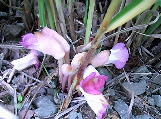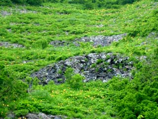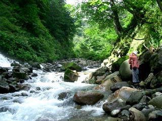 そんなトラノオくんですが、お盆頃から花が咲き始めました。ヒュルヒュルと花茎が伸びてきたな、と思ったら白い花がポツリポツリと開花。花弁が丸く反って、とっても可愛いです♪ 花が咲くなんて初耳だ・・・と思って調べてみると、意外と花を咲かせた方は多いようで、チョッとがっかり(^-^;)。 どうも株がある程度老成してくると花が出やすいようです。 トロピカルな南国調のいい香りと甘い蜜(樹液)が出ました♪ しかし、開花期間は短いです。今日はもう萎んでしまい、満開の時に記念に写しておいて、本当に良かった〜〜♪ (8/16 午後8:30分 撮影) ちなみに、竹でも枯れる前には花を咲かせるとか。 ヤバイ!鉢の中で根が混みあっているのかも? 株分けでもして、若返えって貰おう〜っと(^_-)-☆ NO.210 新発見! 三段の滝 ♪ (05/8/24)久しぶりの好天気となり、またしても山歩きをすることにしました(^_-)-☆ 変わった花が見つかれば・・・と期待しつつ。 場所は鳥海山堰口から法体の滝に向かう途中に池があり、木柵づたいに暫く歩くと「うわ〜〜、こんなところに滝が!」 落差30メートル位ありそうな三段の滝! 水力発電のために利用しているかな? 今まで全く知らなかったけれど、こんなに素敵な滝なのに、観光パンフレットでも見たことがありません(^-^;)。 水しぶきが飛び散り、マイナスイオンをたっぷり浴び、「これぞ、きんぎょの健康術!(^_-)-☆」と、ささやかな幸せに浸って来ました♪ ![]() 右上の画像は、滝の落下地点の雰囲気です。 画像では見にくいですが、顔に水しぶきがかかり、とってもいい気持〜♪ 右の方から川が流れています。 以上地元情報、新発見でした〜♪ (鳥海町ご出身の方、ご存知でした〜?(^_-)-☆) |