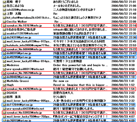 可愛い女性の画像で誘ってメール交換させ、無料を強調しながら、高額の通信料を巻き上げるものだそうです。 「PCからなら、タダじゃない?」と思っても、そこはプロの仕事! あの手この手で、携帯メールに持ち込むらしいです。 当然、皆さんご存知かも知れませんね〜(^-^;)。 でも、つい、好奇心で誘いに乗ってしまうと、大変な事に・・・(^_-)-☆ 何故なら、そのカラクリは??? ![]() これは、ライブドアのサイトに載っていたニュースのコピーの一部ですが、男性が女性に化けて引っかかってきたお客さんと返信メールで通信料を稼いでいた人の言葉です。 インターネットの世界では、こんな仕事にハマって働いている人が大勢いるようです。 女性に成りすまし、あの手この手で通信料を稼ぐのです! 好奇心旺盛な男性の皆様、くれぐれも騙されないよう、気をつけてくださいね〜。 それにしても、このような仕事をして働く人達に、もし家庭があってお子さんが居たりしたら、胸を張って話せる職業でしょうか? 会社に何十台もPCを置いてこういう仕事をさせる会社が蔓延する現社会、本当に困ったものです。 迷惑メールは相手にせず、しっかりネットの健康管理して下さいね(^_-)-☆ NO.316 庭の夏野菜もそろそろ・・・ (06/8/24)昨日23日は処暑。 処暑とは、太陽が150度のときで、暑さが峠を越えて後退し始める頃とか・・・。 まだ昼間は暑い日が続いていますが、朝夕は涼しい風が吹き、気持ち良い時期に入りますね♪。今年の夏は、東北とは思えない日々が今も続いていますが、夜には秋の虫が鳴いています♪ 我家の庭の夏野菜も、そろそろ終わりに近づき、猛暑のお蔭で、けっこう美味しい野菜を楽しむ事が出来ました♪ 沢山採れる時は、ジュースやお漬物など保存食にしますが、そろそろ終わりとなると、だんだん愛しく思えて来るのは私だけ?(^-^;) 今日午前中はフラダンスの自主練習で汗を流し、 午後は終わりに近づいた夏野菜を収穫し、記念撮影してみました(^-^;) 野菜作りの主役は主人です(^-^;) 色々恩恵を受けてますが、草取りなど簡単な作業は、きんぎょの担当です(^-^;) 写真はモロヘイヤ、つるむらさき、ブルーベリ、ミニトマト、完熟トマト、キューリ。 特にブルーベリーは、主人の好みで、PC疲れの目には最高です! まだまだ収穫できますよ〜♪ NO.317 そろそろ秋野菜の準備・・・ (06/8/27)![]() 野菜作り主役の主人が、早々に夏野菜の片付けしていました(^-^;) 「あらら〜、まだ収穫出来るのに〜〜^-^;」と思いつつ、抜き終えたトマト等を片付けながら、記念に盗撮(~=~;) (撮影場所:庭 撮影日時 25日午後5時半頃) ![]() 秋大根の畝を作って肥料入れたり、穴を開けたりしています。 朝っぱらから汗ビッショリ掻いて、 本当にご苦労様〜〜(^-^;) 猫の額ほどの家庭菜園ですが、我家の健康法です〜♪ (撮影場所:庭 撮影日時 26日午前5時半頃) ![]() 種蒔きまでフルコースで働いているところを、庭の草取りしながら又また盗撮(^-^;) たったこれくらいの大根でも、多分、来春まで食べられます♪ 左にチョッと写っているのは、山芋です♪ 大好き野菜ですし、体にも良いので、毎年欠かさず作っています♪ 毎年、趣味のように人間ドックを受けていますので、今年も本日行って来ました。 検査の9割は当日判定が出ますが、 今年も「優秀ですね〜♪」を期待して受けたのに・・・ コレステロールが基準値をオーバーとか〜〜(~=~;) 去年までは、基準値内にしっかり収まっていたのに・・・・(^-^;) やはり、食べ過ぎ?・・・(^-^;) でも、原因は他にもあります。食べてすぐソファに寝転がってTV三昧・・・ 生活習慣、変えなくっちゃ〜〜(^_-)-☆ (主人は良かったみたい・・・^-^;) NO.318 酒の肴にトビタケ(トンビマイタケ)♪ (06/8/29)こちらのお盆の帰省客には、トビタケ(トンビマイタケ)をご馳走するのが定番と聞いていますが、山に生えてる天然物ですと1キロ5000円もする 高級品です(出始めなら1万円?)。何故天然物は高級なのかは、一度体験すると良く分ります(~-~;) 我家には、山歩きのプロが友人にいますので、こんな高級品を時々ご馳走してくれます♪ 見てくれは真っ黒ですが、マイタケの仲間なので味は美味! 今日、お茶飲みの誘いがあって、珍味を食して来ました♪ 画像は、チャッカリ頂いて来たトビタケです(^-^;) でも、お酒は飲んでいません。飲酒運転になりますから〜(^_-)-☆ 飲酒運転と言えば一昨日、福岡市東区「海の中道大橋」で後ろから来た飲酒運転の車に追突されたRV車が海に落ち、3幼児死亡という、 悲しい、悲しい事故がありましたね。 普段どんなに真面目でも、お酒が入ると人格が変わる場合もあるわけですし、飲酒運転に、もっともっと厳しい罰則があってもいいと、被害者の立場でつくづく思いました・・・。 いえ、加害者だって、人生が狂ってしまいます。 肝に銘じて、飲酒運転は絶対避けましょう!! 何故、天然物は高級なのか? トンビマイタケの初体験はこちらでご覧いただけます(^-^;) NO.319 間もなく収穫の