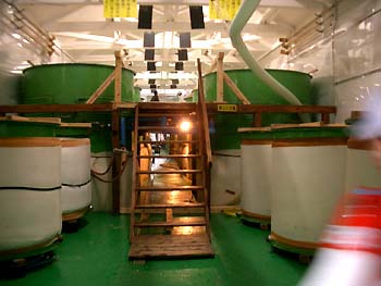366 天寿酒造蔵開放&イベント♪ (07/2/10)今日は、お酒好きには嬉しい地元(と言っても隣の矢島町)の天寿酒造」さんの『蔵開放日』です。10時半頃着いたら、もう沢山のお客様で賑わっていました。 早速、説明員(蔵人)によってお酒作りの説明から始まり、工場見学(酒蔵探検)しながら、にごり酒やしぼりたての生酒をご馳走になって来ましたよ〜(=^ε^= ) (でも、下戸なんですけどね〜^-^;) ![]() ![]() 階段登ると発酵しているお酒を見せて頂きました。 日が浅いのはボコボコと泡が大きく、25日位経過すると、小さい泡が・・・。 右下はお酒専用のお米「美山錦」「山田錦」を農家と契約して作って貰い、65%、50%、大吟醸は35%まで精米してしまうそうです。 「ヒエ〜、65%が糠になり無駄になるのかしら?」と質問すると、キノコ作りの床に売られろとか。 (それなりに利用価値はありますね〜^-^;) 蔵の様子はTVで見たことありますが、生で見るのは初めてなんですよ〜(=^ε^= ) ![]() ![]() ![]() 今年は、例年にない超々雪不足なのに、この雪、変でしょ? 実は先日、由利本荘市矢島町の山間部の軽井沢という所からダンプ25台も雪を運んで来たそうです。 ここは、雪中貯蔵庫と言って、今期しぼりたてのお酒を氷温貯蔵しておき、しぼりたて生酒が、無くなった時期の5月に開封して一般販売になるそうです。 しぼりたての味が、5月に又楽しめるなんて、酒好きにはタマラナイようですよ〜(^_-)-☆ つき立てのお餅で、お汁粉の無料サービスあり♪(美味しかったですよ〜) ![]()